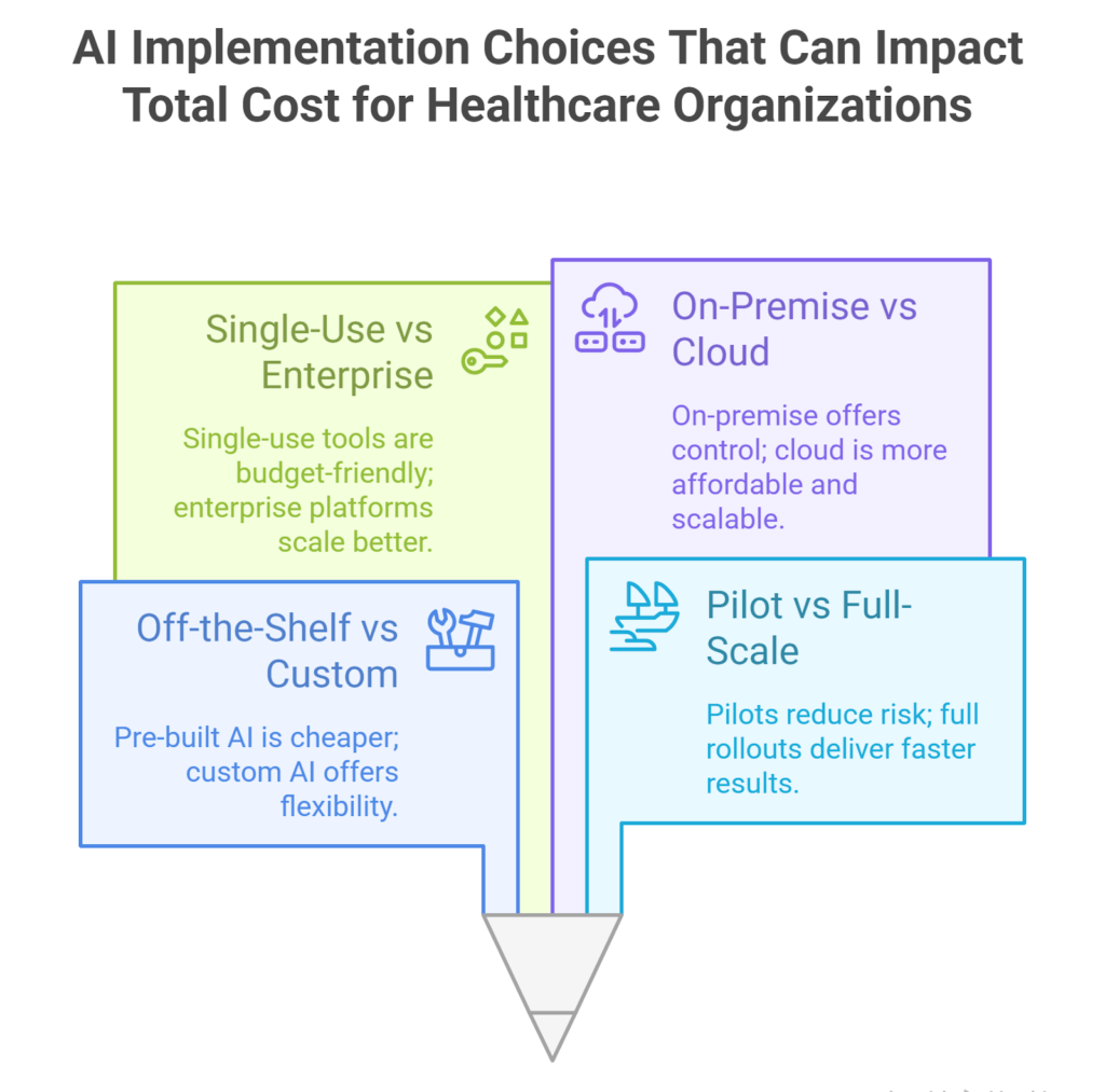 Smaller clinics can usually get started with less, especially using cloud-based tools and vendor-managed services. Larger healthcare providers often aim bigger from the start, which drives costs up, but also brings more system-wide impact.